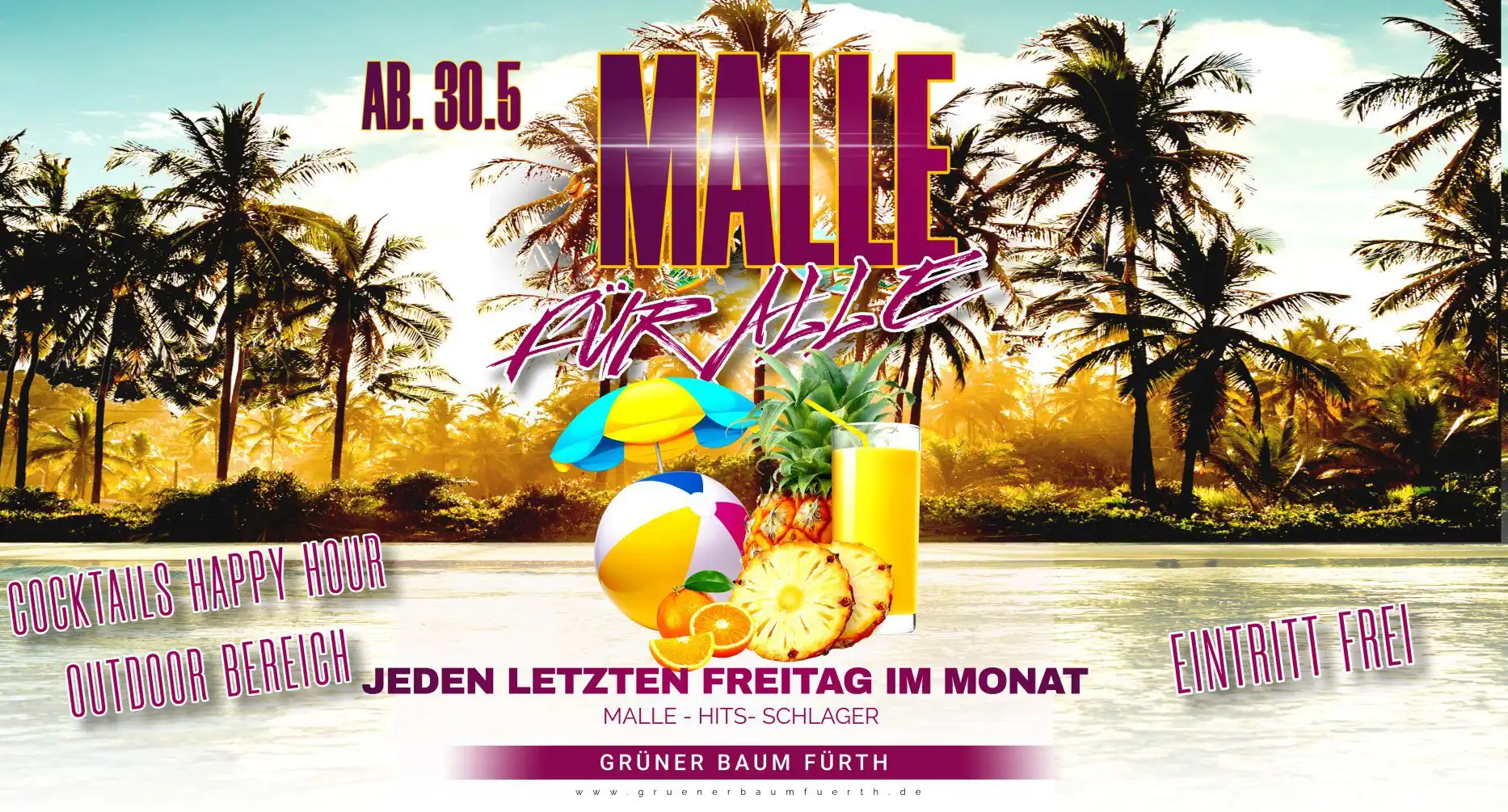 Malle für Alle COCKTAILS HAPPY HOUR OUTDOOR BEREICH JEDEN LETZTEN FREITAG IM MONAT MALLE – HITS- SCHLAGER GRÜNER BAUM FÜRTH 11 Feb. 08:00 - 18:00 Grüner Baum Gustavstr. 34, 90762 Fürth
