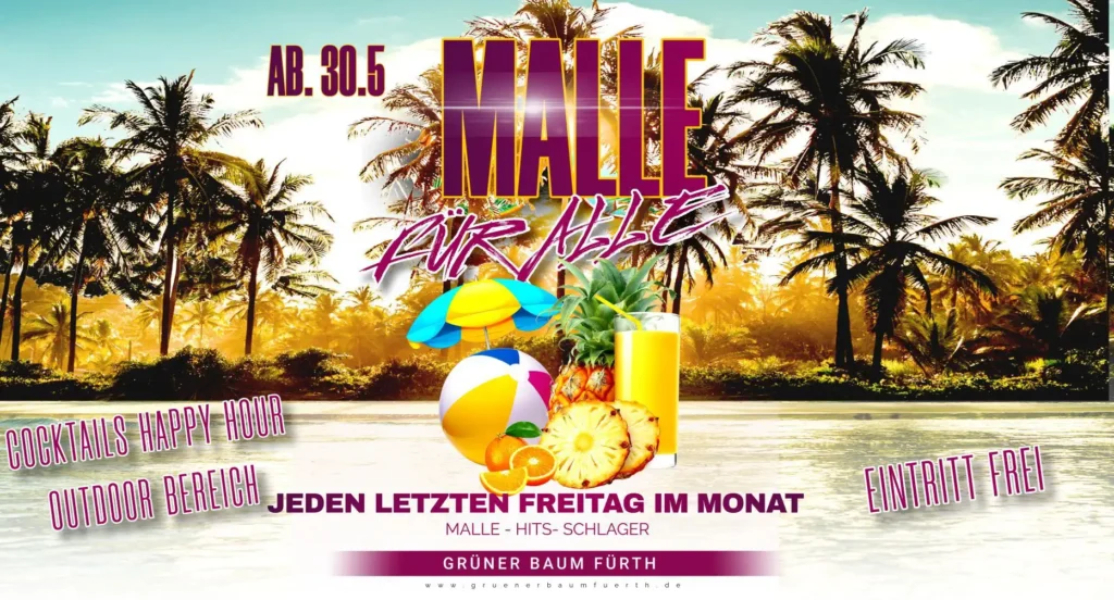 Malle für AlleCOCKTAILS HAPPY HOUR OUTDOOR BEREICH JEDEN LETZTEN FREITAG IM MONAT MALLE – HITS- SCHLAGER GRÜNER BAUM FÜRTH